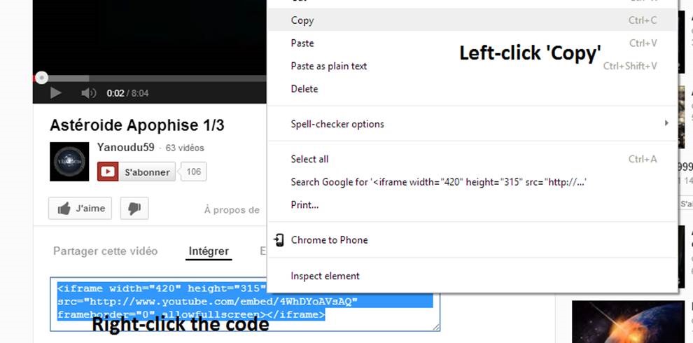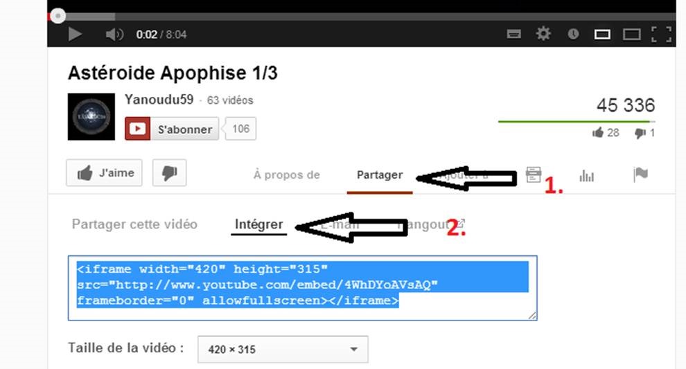 - Allez à votre vidéo, en ligne, et trouvez le code HTML pour intégrer la vidéo :