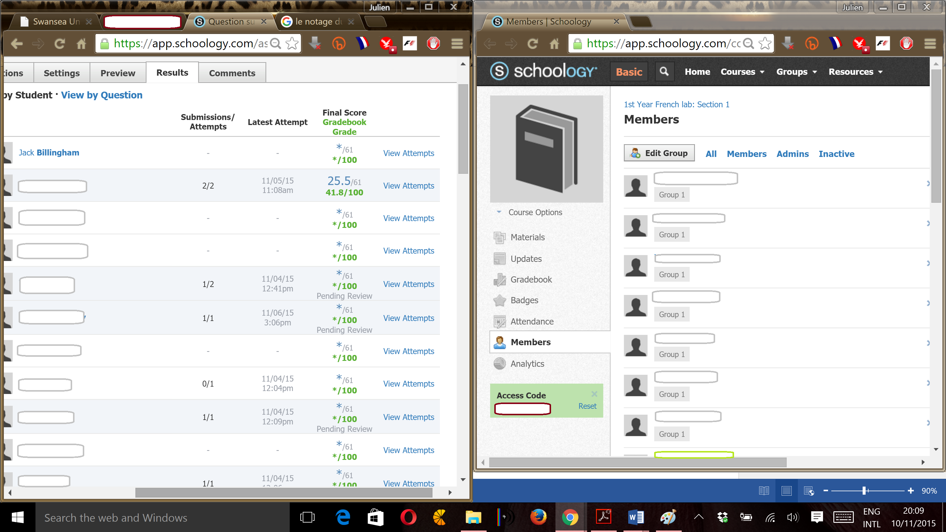 4. a) Mettez les 2 fenêtres l’une à côté de l’autre, pour voir d’une part les membres du groupe que vous corrigez, et de l’autre les tentatives des étudiants.